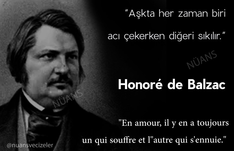 BALZAC Aralık 19, 2018 By Nuans Vecizeler “Aşkta her zaman biri acı çekerken diğeri sıkılır.” Honoré de Balzac Bunu paylaş: X'te paylaşmak için tıklayın (Yeni pencerede açılır) X Facebook'ta paylaşmak için tıklayın (Yeni pencerede açılır) Facebook Beğen Yükleniyor... İlgili
