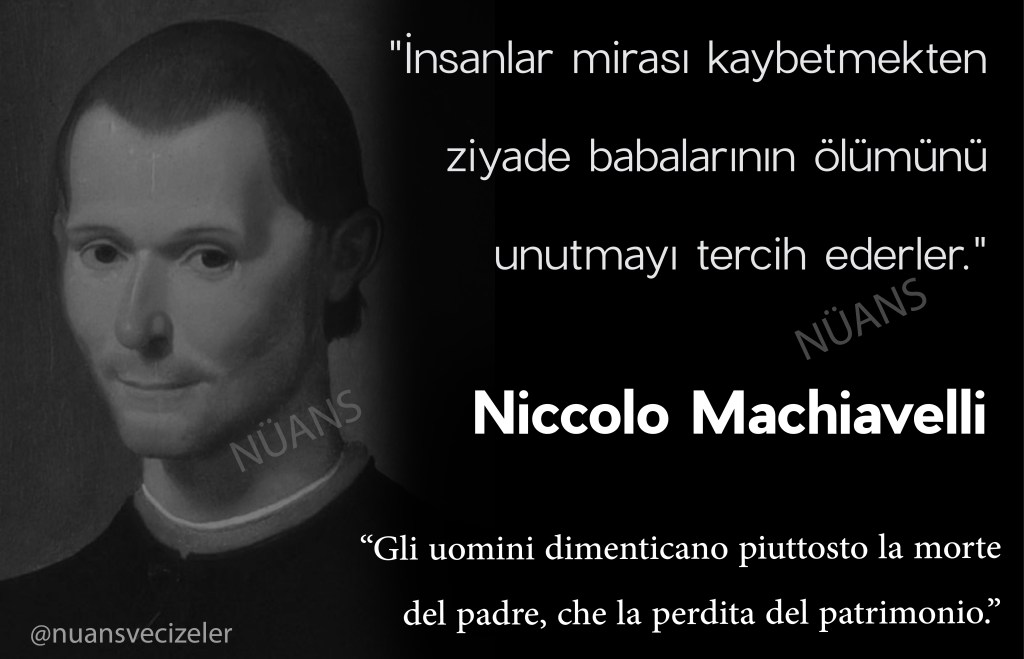 Niccolo Machiavelli Aralık 22, 2018 By Nuans Vecizeler “İnsanlar mirası kaybetmekten ziyade babalarının ölümünü unutmayı tercih ederler.” Niccolo Machiavelli Bunu paylaş: X'te paylaşmak için tıklayın (Yeni pencerede açılır) X Facebook'ta paylaşmak için tıklayın (Yeni pencerede açılır) Facebook Beğen Yükleniyor... İlgili