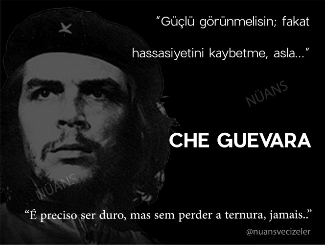 Che Guevara Aralık 23, 2018 By Nuans Vecizeler “Güçlü görünmelisin; fakat hassasiyetini kaybetme, asla…”Che Guevara Bunu paylaş: X'te paylaşmak için tıklayın (Yeni pencerede açılır) X Facebook'ta paylaşmak için tıklayın (Yeni pencerede açılır) Facebook Beğen Yükleniyor... İlgili