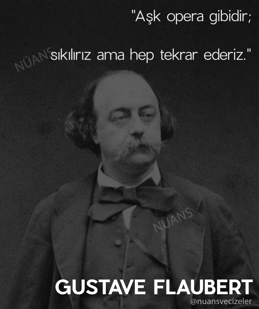 Gustave Flaubert Aralık 23, 2018 By Nuans Vecizeler “Aşk opera gibidir, sıkılırız ama hep tekrar ederiz.”Gustave Flaubert Bunu paylaş: X'te paylaşmak için tıklayın (Yeni pencerede açılır) X Facebook'ta paylaşmak için tıklayın (Yeni pencerede açılır) Facebook Beğen Yükleniyor... İlgili