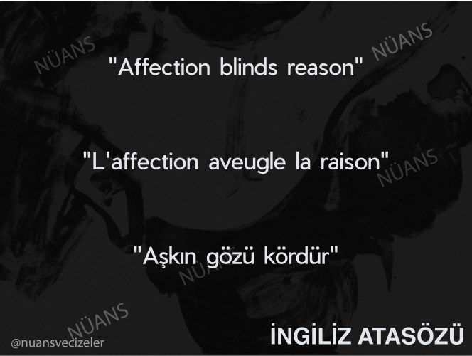 İngiliz Atasözü Aralık 23, 2018 By Nuans Vecizeler “Aşkın gözü kördür.”2 İngiliz Atasözü Bunu paylaş: X'te paylaşmak için tıklayın (Yeni pencerede açılır) X Facebook'ta paylaşmak için tıklayın (Yeni pencerede açılır) Facebook Beğen Yükleniyor... İlgili