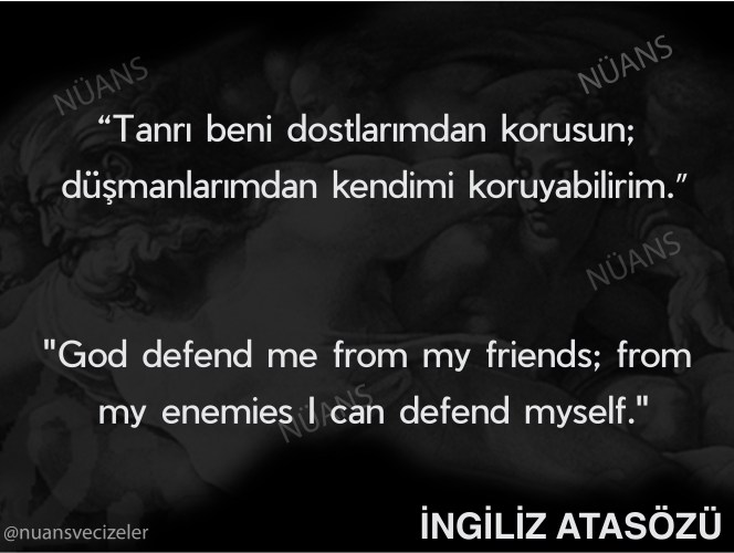 İngiliz Atasözü Aralık 23, 2018 By Nuans Vecizeler “Tanrı beni dostlarımdan korusun; düşmanlarımdan kendimi koruyabilirim.” İngiliz Atasözü Bunu paylaş: X'te paylaşmak için tıklayın (Yeni pencerede açılır) X Facebook'ta paylaşmak için tıklayın (Yeni pencerede açılır) Facebook Beğen Yükleniyor... İlgili