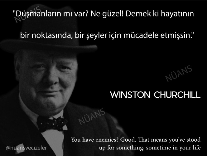Winston Churchill Aralık 23, 2018 By Nuans Vecizeler “Düşmanların mı var? Ne güzel! Demek ki hayatının bir noktasında, bir şeyler için mücadele etmişsin.” Winston Churchill Bunu paylaş: X'te paylaşmak için tıklayın (Yeni pencerede açılır) X Facebook'ta paylaşmak için tıklayın (Yeni pencerede açılır) Facebook Beğen Yükleniyor... İlgili