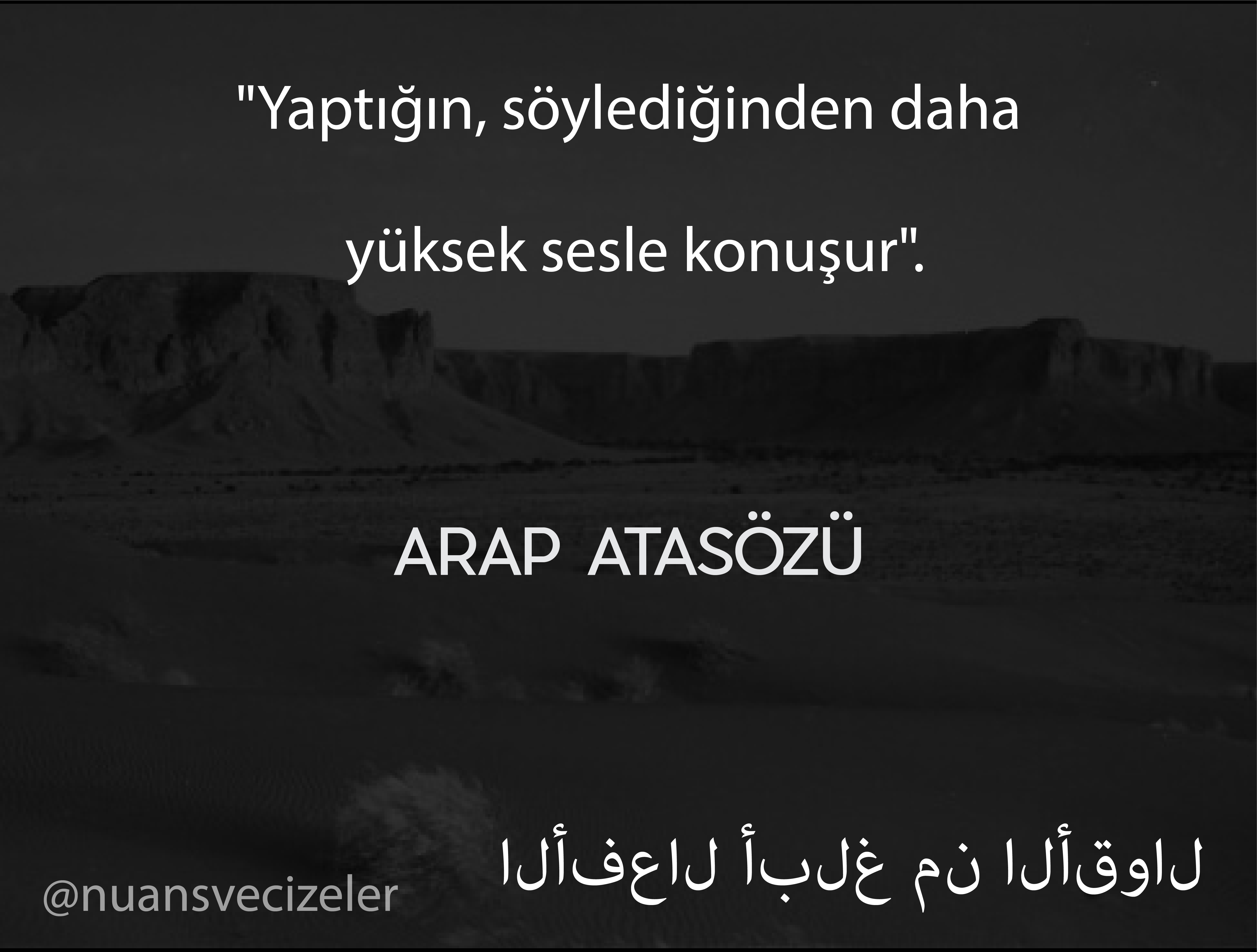 Arap Atasözü Aralık 24, 2018 By Nuans Vecizeler “Yaptığın, söylediğinden daha yüksek sesle konuşur.” Arap Atasözü Bunu paylaş: X'te paylaşmak için tıklayın (Yeni pencerede açılır) X Facebook'ta paylaşmak için tıklayın (Yeni pencerede açılır) Facebook Beğen Yükleniyor... İlgili
