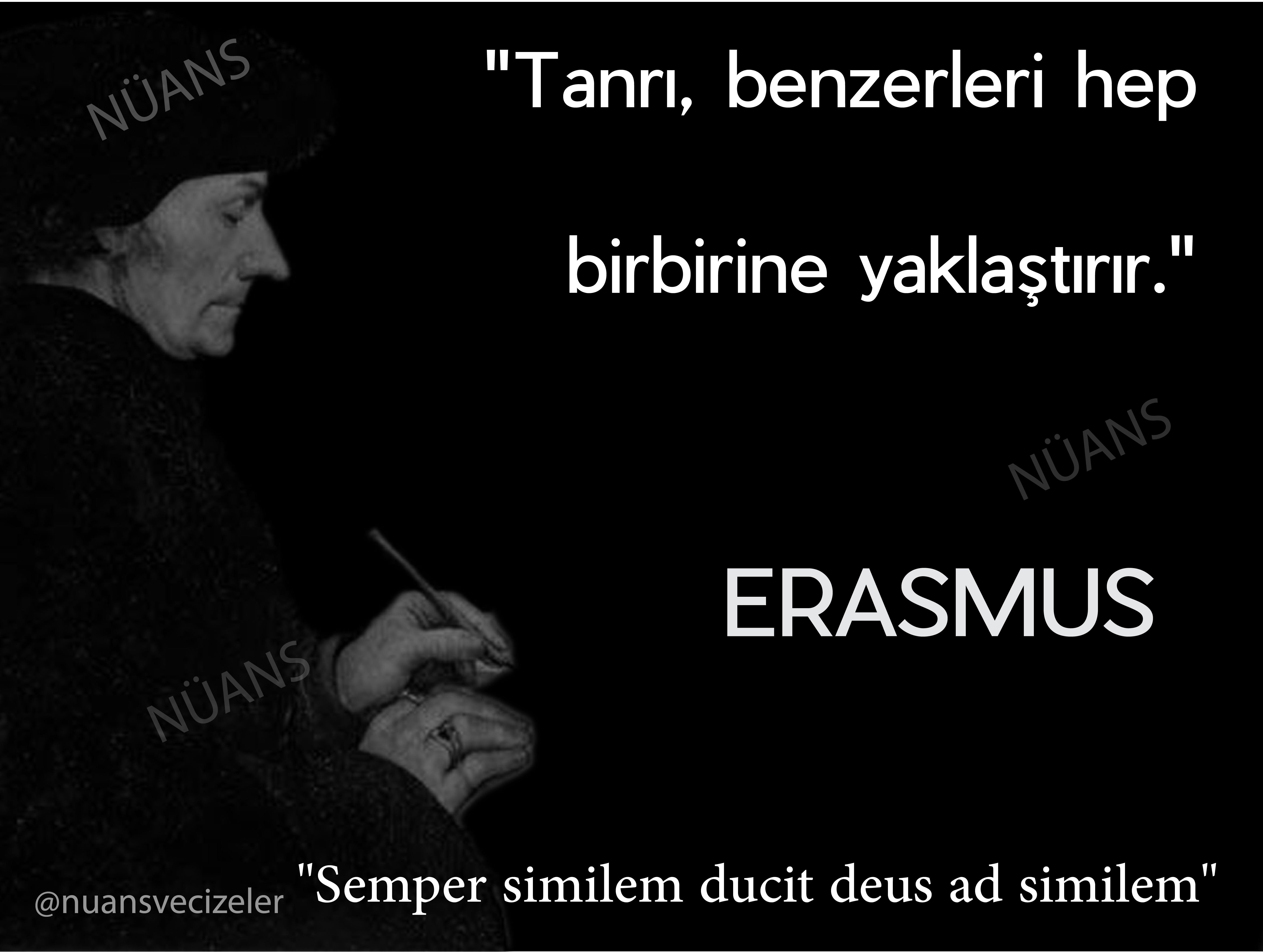 Erasmus Aralık 24, 2018 By Nuans Vecizeler “Tanrı, benzerleri hep birbirine yaklaştırır.” Erasmus Bunu paylaş: X'te paylaşmak için tıklayın (Yeni pencerede açılır) X Facebook'ta paylaşmak için tıklayın (Yeni pencerede açılır) Facebook Beğen Yükleniyor... İlgili