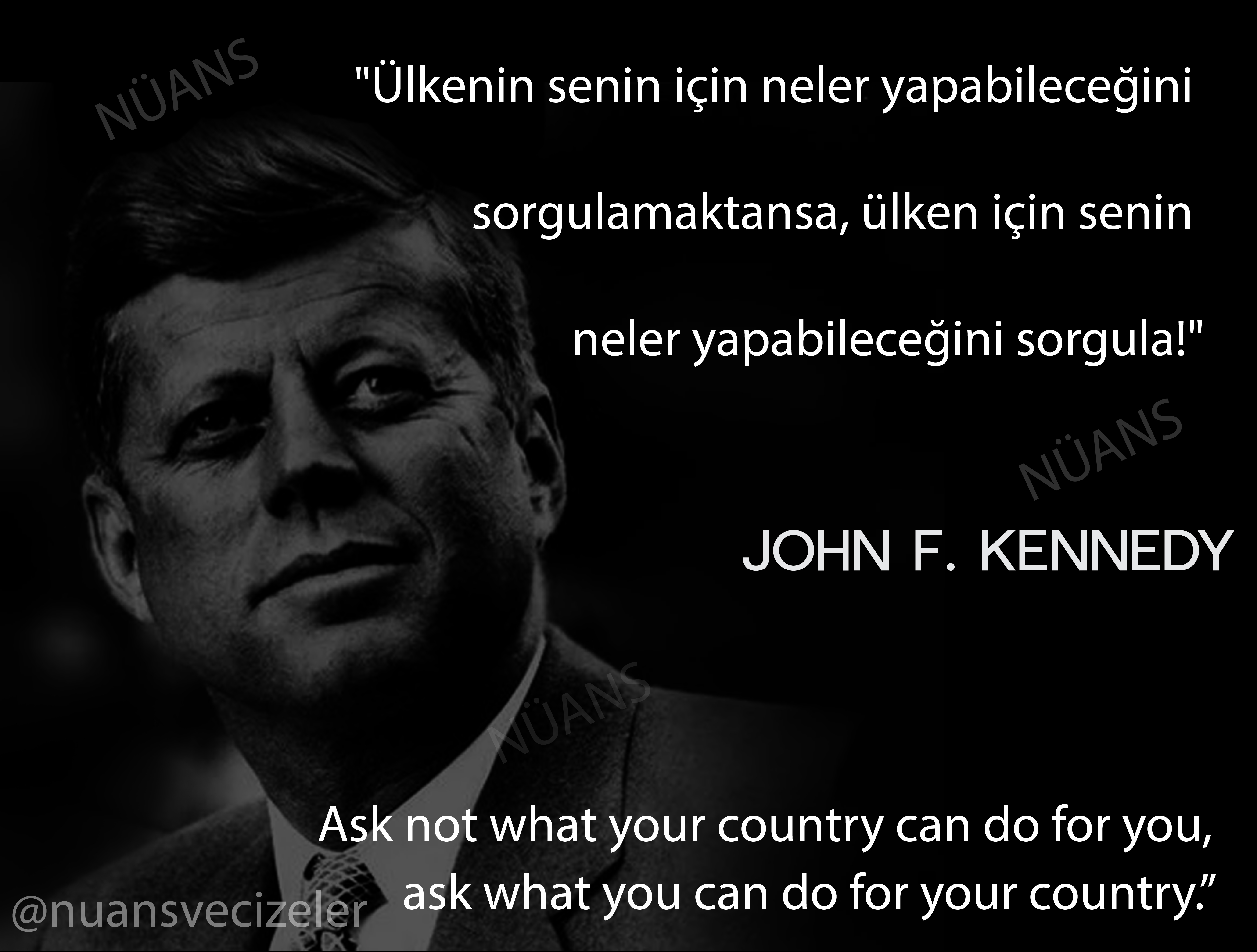 John F. Kennedy Aralık 24, 2018 By Nuans Vecizeler “Ülkenin senin için neler yapabileceğini sorgulamaktansa, ülken için senin neler yapabileceğini sorgula!” John F. Kennedy Bunu paylaş: X'te paylaşmak için tıklayın (Yeni pencerede açılır) X Facebook'ta paylaşmak için tıklayın (Yeni pencerede açılır) Facebook Beğen Yükleniyor... İlgili