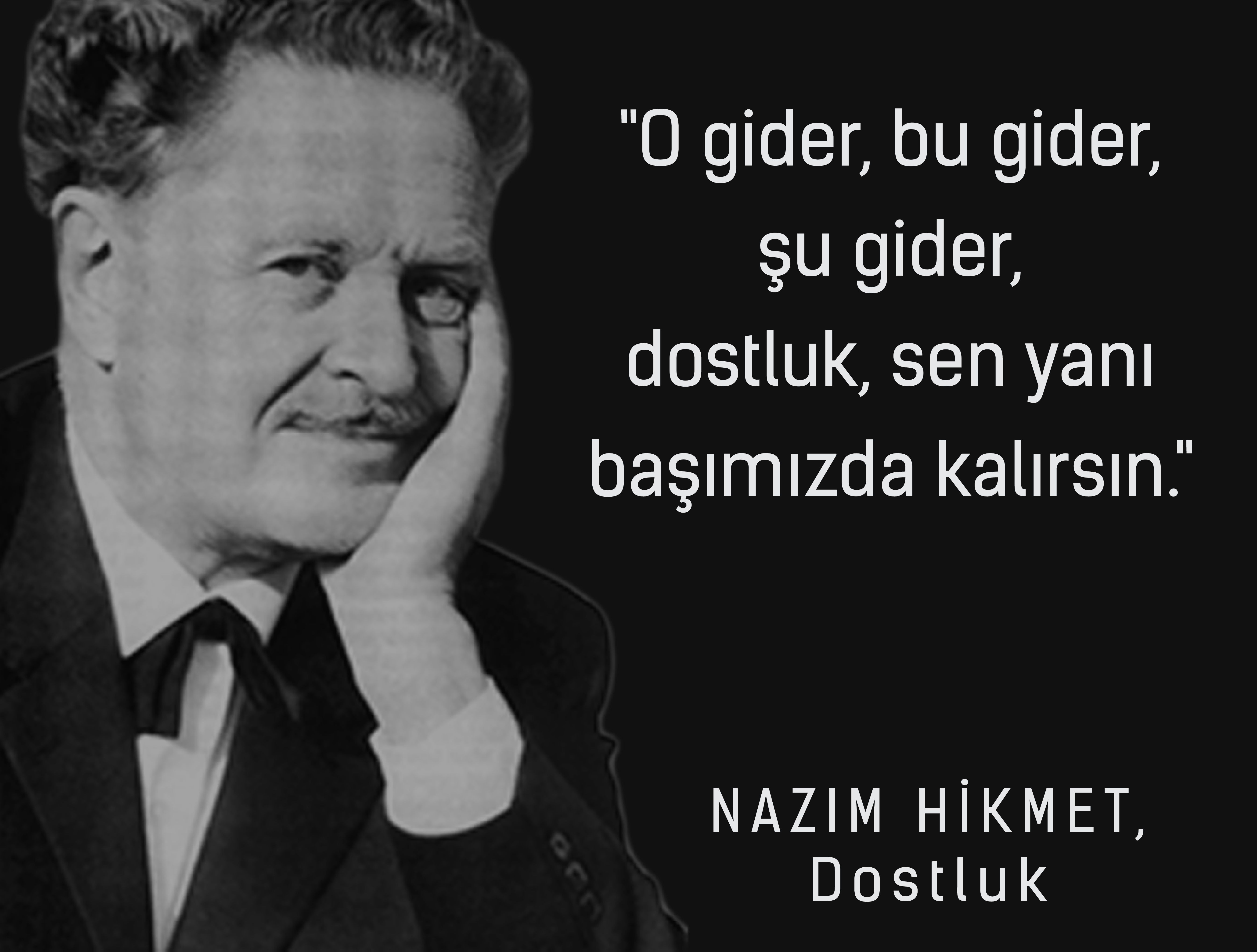 Nazım Hikmet Aralık 24, 2018 By Nuans Vecizeler “O gider, bu gider, şu gider, dostluk, sen yanı başımızda kalırsın.” Nazm Hikmet, Dostluk Bunu paylaş: X'te paylaşmak için tıklayın (Yeni pencerede açılır) X Facebook'ta paylaşmak için tıklayın (Yeni pencerede açılır) Facebook Beğen Yükleniyor... İlgili