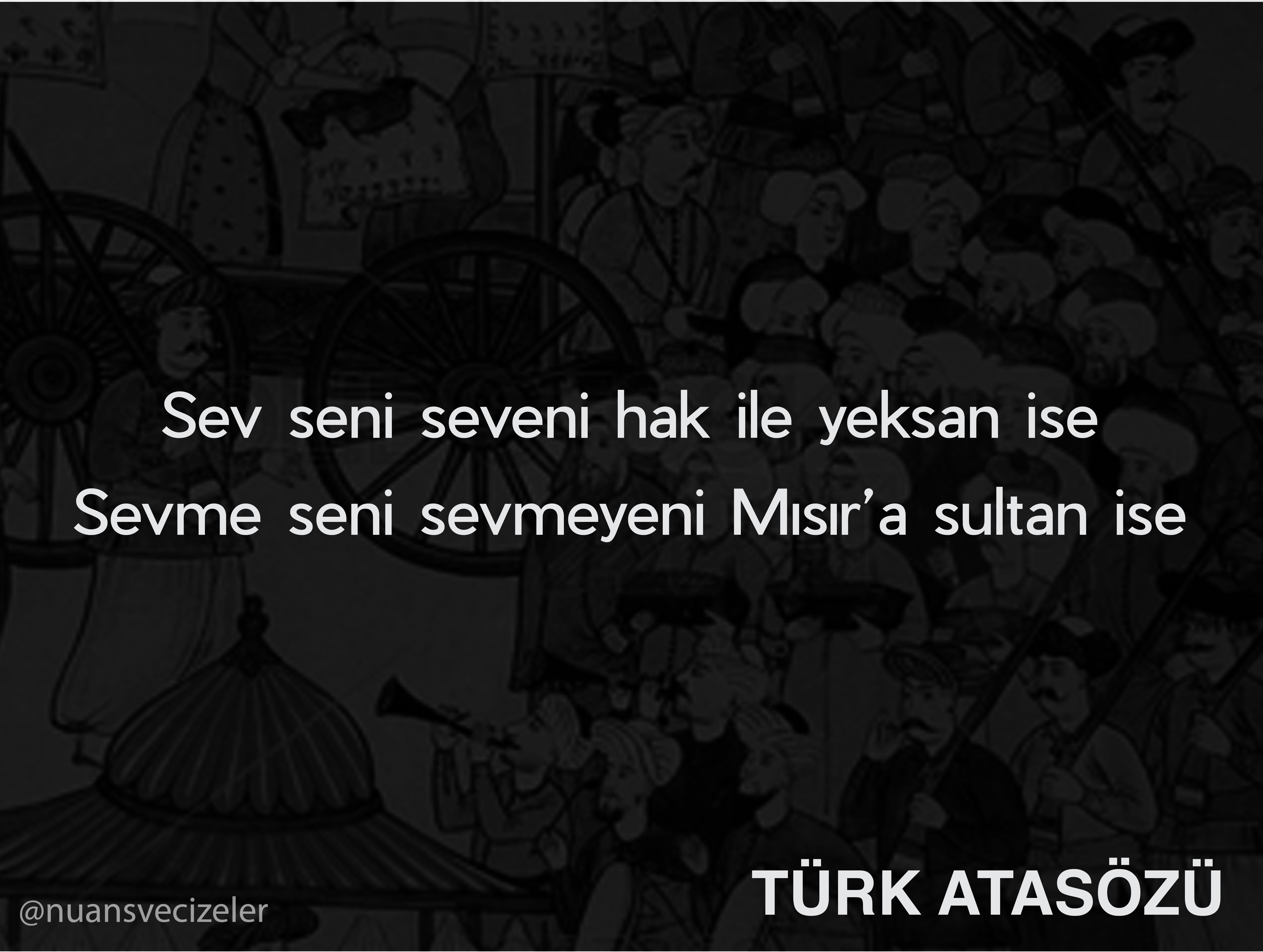 Türk Atasözü Aralık 24, 2018 By Nuans Vecizeler Sev seni seveni hak ile yeksan iseSevme seni sevmeyeni Mısır’a sultan ise Türk Atasözü Bunu paylaş: X'te paylaşmak için tıklayın (Yeni pencerede açılır) X Facebook'ta paylaşmak için tıklayın (Yeni pencerede açılır) Facebook Beğen Yükleniyor... İlgili