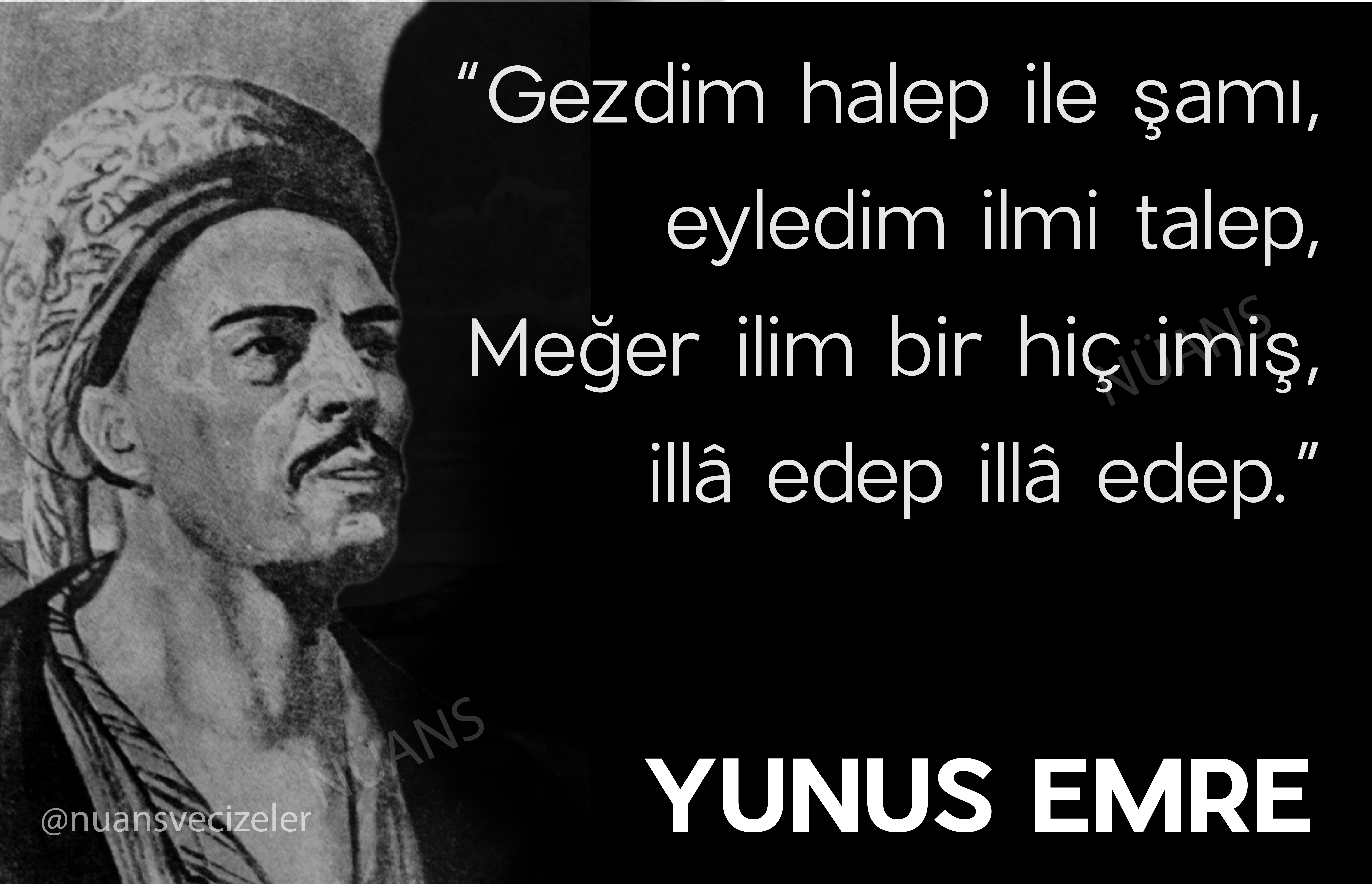 Yunus Emre Aralık 24, 2018 By Nuans Vecizeler “Gezdim halep ile şamı, eyledim ilmi talep,Meğer ilim bir hiç imiş, illâ edep illâ edep” Yunus Emre Bunu paylaş: X'te paylaşmak için tıklayın (Yeni pencerede açılır) X Facebook'ta paylaşmak için tıklayın (Yeni pencerede açılır) Facebook Beğen Yükleniyor... İlgili