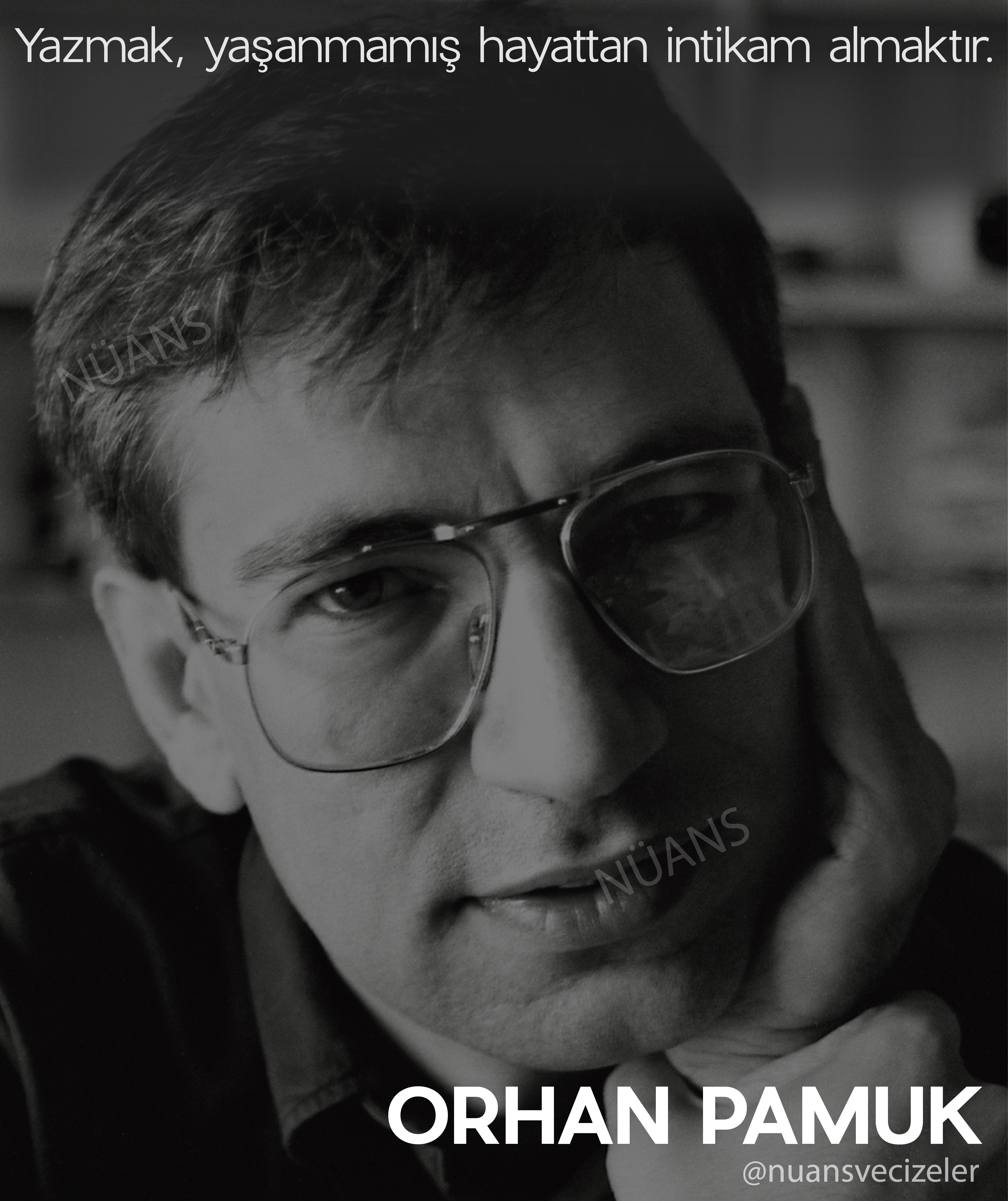 Orhan Pamuk Aralık 29, 2018 By Nuans Vecizeler “Yazmak, yaşanmamış hayattan intikam almaktır.” ORHAN PAMUK Bunu paylaş: X'te paylaşmak için tıklayın (Yeni pencerede açılır) X Facebook'ta paylaşmak için tıklayın (Yeni pencerede açılır) Facebook Beğen Yükleniyor... İlgili